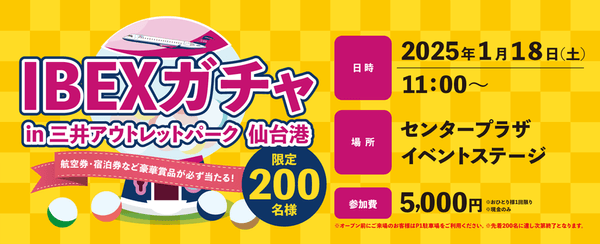 アイベックスエアラインズ株式会社(以下 IBEX)は、皆さまへワクワクする体験をお届けするため「IBEXガチャ in 三井アウトレットパーク 仙台港」を開催します。