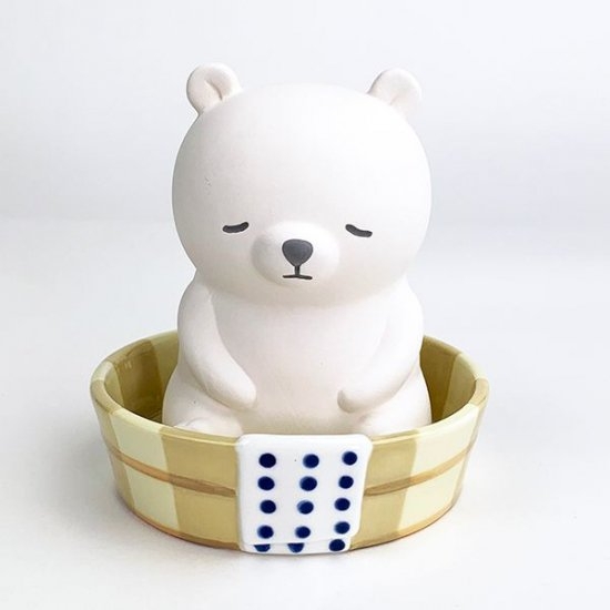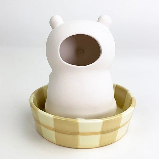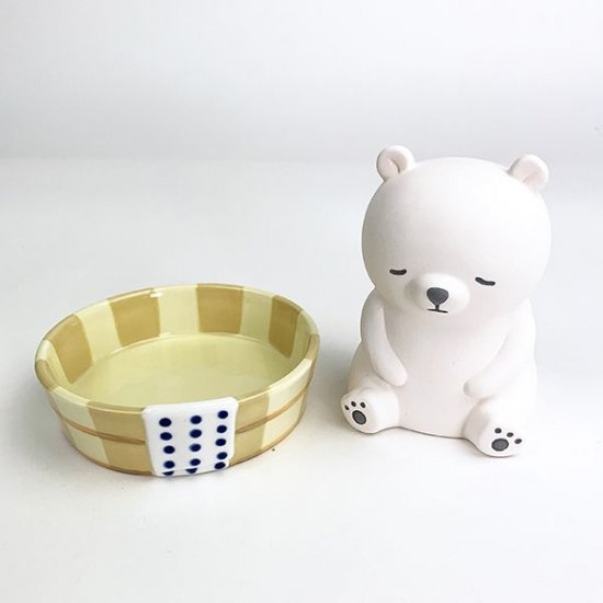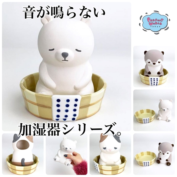 こちらはシロクマさんの加湿器。シロクマさん本体は素焼きになっており独特の質感が人気の秘密です。銭湯の桶にちょこんと座っているデザインがほっこり可愛いですよね♪桶と素焼き本体は独立しているので、取り外せますよ。
