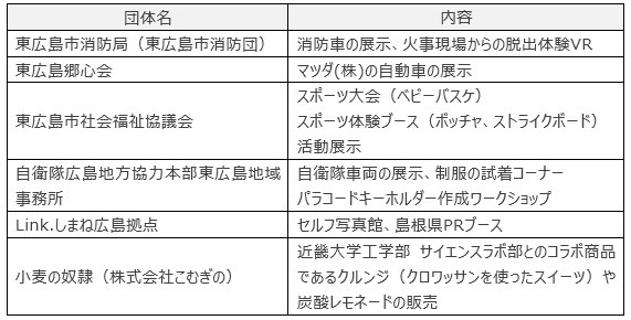 さらに、東広島市消防局(消防団)、東広島市社会福祉協議会など6つの外部団体のブースも設け、地域の方と交流を深める機会とし、「小麦の奴隷(株式会社こむぎの)」と「近畿大学工学部 サイエンスラボ部」のコラボ商品であるクルンジ(クロワッサンを使ったスイーツ)や炭酸レモネードの販売も行います。