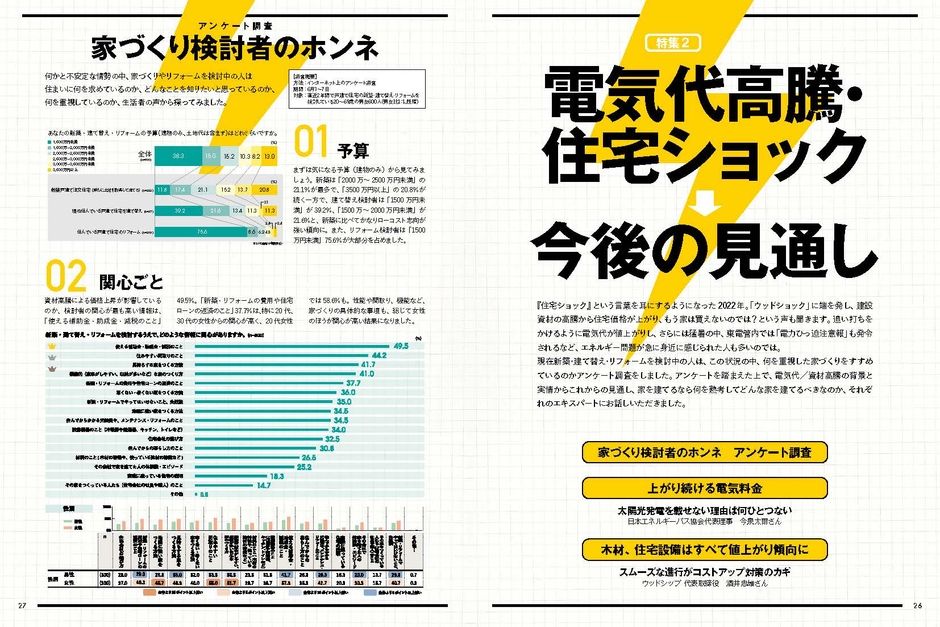 特集は「性能と家事動線間取りで子育てはちょっと”おおらか”に」と「電気代高騰・住宅ショック→今後の見通し」です。