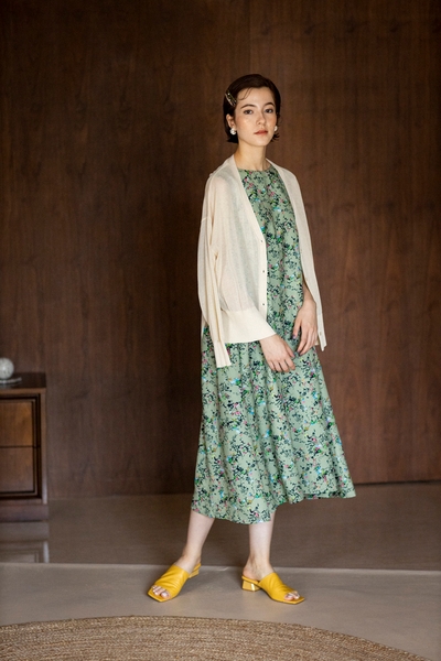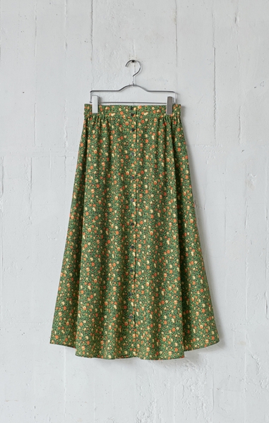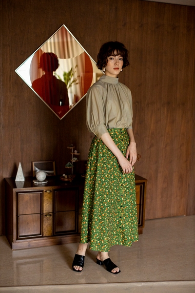 レトロな花柄にフロントボタンが上品なデザイン。たっぷりとしたフレアシルエットが華やかな印象を与えてくれます。