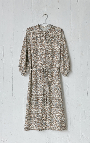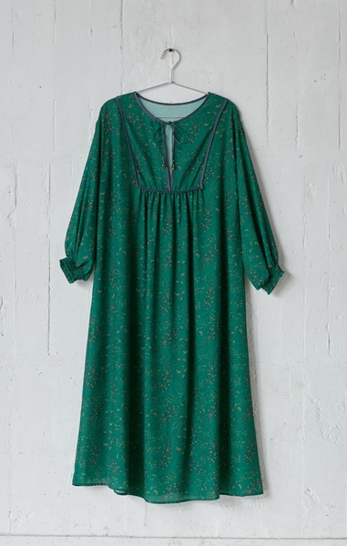 胸元のパイピングの配色使いが特徴のカフタンデザイン。ボリュームのあるシルエットが女性らしい雰囲気に仕上げてくれます。