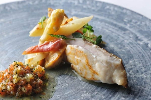 北寄貝や白貝、白ワインで仕上げた、貝出汁の旨味が効いたソースにホワイトアスパラガスやウドなど春の食材を合わせたさわやかな魚料理です。アサリの出汁で飴色になるまでじっくりと炒め煮にした野菜を付け合わせに添えました。貝出汁の旨味が魚の旨味をより引き立てるさわやかな一皿です。