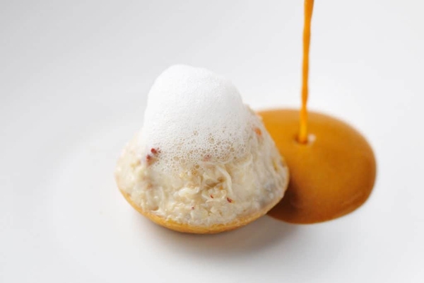 春になるとお花見に欠かせない食材として青森県で親しまれてきた栗蟹を贅沢に丸ごと使用した一皿です。蟹のみそや殻を余すことなく濃厚なビスクに仕上げ、スパイシーな軍鶏肉を合わせました。柔らかく甘みのある蟹のほぐし身と脂の香りが濃厚な軍鶏肉は相性ぴったりです。重厚ながらもアブサンの香りで後に引かないさわやかな味わいが楽しめます。