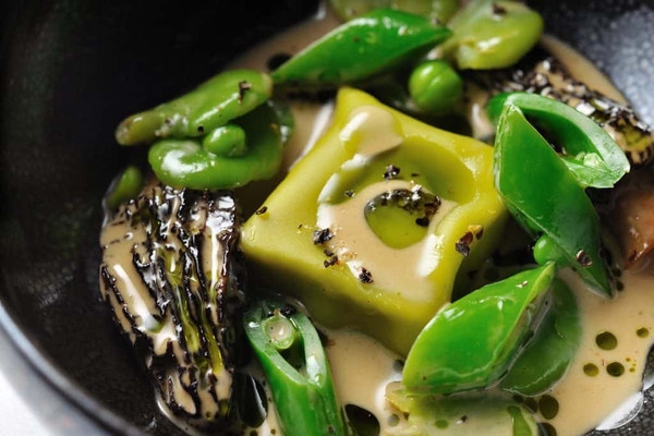 帆立の旨味がつまった「豆しとぎ」のラビオリをベースに春の訪れを告げるモリーユと旬豆を合わせた、濃厚な豆の旨みと甘みを楽しめる一品です。冷害に見舞われることが多かった青森県南部地方では、貴重な米の代わりに豆を用いて作る餅「豆しとぎ」が食されており、現在も郷土料理として受け継がれています。ラビオリに合わせたモリーユと旬豆の奥深い上品な香りが重層的な味わいを引き立てる春らしい一皿です。