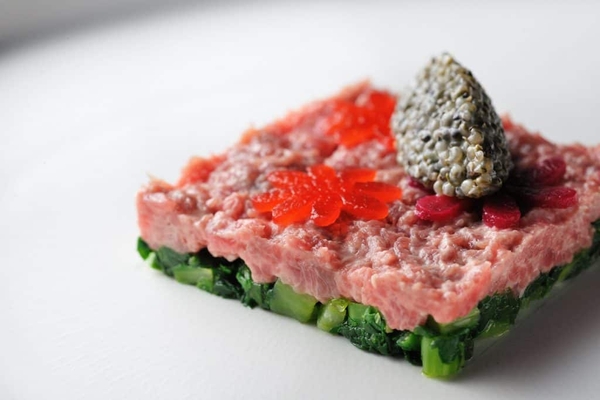 少し大きめにカットした鮪と旬の春キャベツを合わせた一品です。春キャベツの甘味がほのかに香るチュイルの下には、特製の魚醤のタレを使った鮪と火入れした長芋、鶉卵の温玉を合わせました。長芋にしっとりと火を入れることで、柔らかい食感の長芋と鮪の食感がぴったりと調和します。温玉がとろりと絡み合いまろやかな味わいも楽しめます。キャベツのチュイルをアクセントに添え、噛むごとに鮪とキャベツの香りと余韻が引き立つ一皿です。