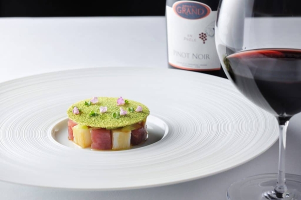 赤身が濃くなる春の鮪には、なめらかな酸味と赤果実の香りが豊富なピノ・ノワールが良く合います。旨味が強いワインで、赤身と合わせることで鮪の深いコクと味合いを堪能できます。