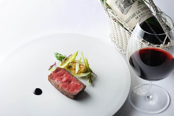 炭火でじっくりと火を入れた牛肉に、清涼感のあるボルドー地方の赤ワインを合わせます。14年間の熟成がつくり出す魅力的な香りが牛肉の香りと合わさることにより肉料理の繊細な味わいを引き立てます。