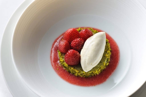 ピスタチオペーストのヌガーグラッセにクレームディプロマットと苺を合わせたさわやかな春の一皿です。ヌガーグラッセにはフレンチメレンゲを加え、濃厚ながらも軽やかな口当たりになるように仕立てました。春らしいさわやかな苺の甘酸っぱさはピスタチオの濃厚な味わいと相性ぴったりです。