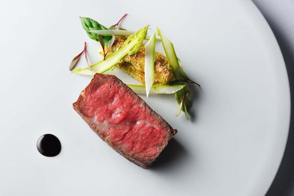 メインの牛肉は炭火でじっくりと焼き上げることで、牛肉本来の旨味をしっかりと閉じ込め、噛めば噛むほど旨味が広がる一皿です。牛肉にはスパイシーでキレのある旨味たっぷりの赤ワインソースを合わせました。付け合わせにはオランデーズソースをかけたアスパラガスと、食感と香りのアクセントにカリカリに焼いたエシャロットを添え、香ばしさを加えました。