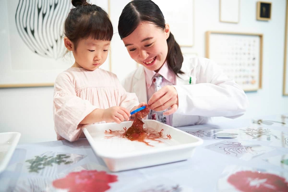 クイズや観察を通して、親子で海藻について知ることができる体験型のプログラムを開催。海藻といえば地味な見た目を思い浮かべますが、まるで花のように鮮やかな色や形をしたものも多く存在します。本プログラムでは、そんな海藻の知られざる一面を楽しみながら知れるよう、スタッフがクイズ形式で海藻の紹介をします。さらに、プログラムの中には海藻に触れる体験も用意。水中で広げることで花のような形になる海藻の観察や、種類によって異なる手触りを楽しむこともできます。