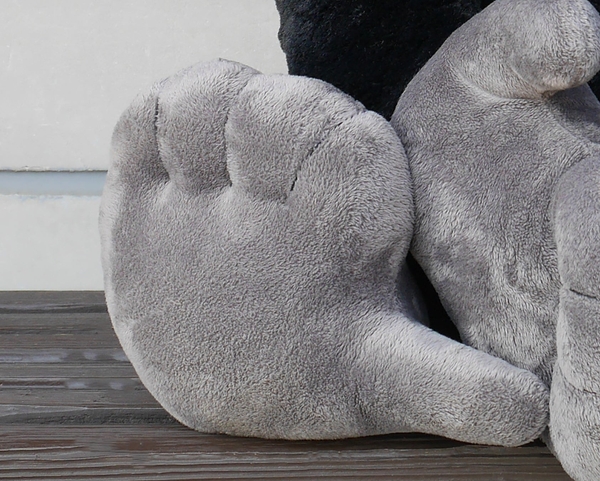 ナックルとは英語で「指の関節」のこと。ゴリラは手を握って指の背側を地面につけて歩きます。これを「ナックルウォーク」と呼びます。この「こぶし」をついて歩く独特のウォーキングをぬいぐるみでも再現するため、手の平に面ファスナーを付け、指を折り曲げられるようにしました。