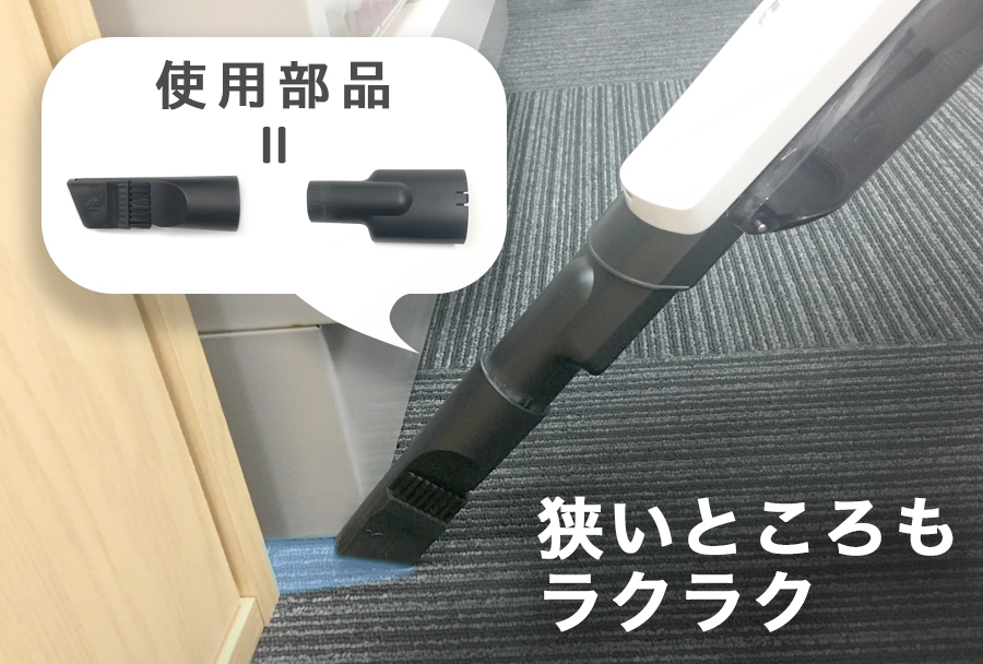 細いノズルやブラシも付属。家具の隙間にもスッと入ります。