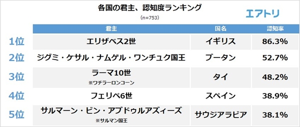 「エリザベス2世」の認知度は86.3%!2位には幸せの国・ブータンの「ワンチュク国王」がランクイン