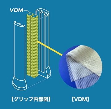 特殊なメッシュ状の新振動吸収素材「VDM」をグリップ部に内蔵。従来素材よりも広範囲にわたって使用することで、打ち負けない衝撃吸収性を実現しました。