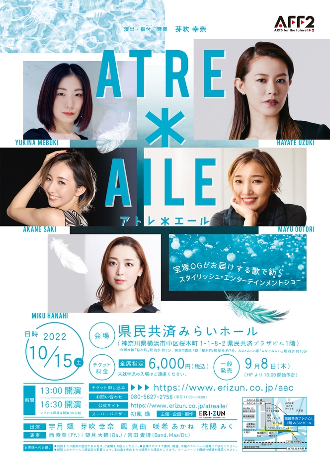 株式会社ERIZUN主催、宝塚OGがお届けする歌で紡ぐスタイリッシュ・エンターテインメントショー『ATRE*AILE』が2022年10月15日(土)に県民共済みらいホール(横浜市中区)にて開催されます。チケットはカンフェティ(運営:ロングランプランニング株式会社、東京都新宿区、代表取締役:榑松 ⼤剛)にて発売中です。