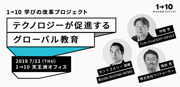 株式会社ワントゥーテン(本社:京都市、代表取締役社長:澤邊芳明、以下 1→10)は、教育プロジェクトとして発足した「1→10 学びの改革プロジェクト」(以下、本プロジェクト)の一環として、トークイベント第2弾「テクノロジーが促進するグローバル教育」を7月11日(木)に1→10天王洲オフィスにて開催いたします。