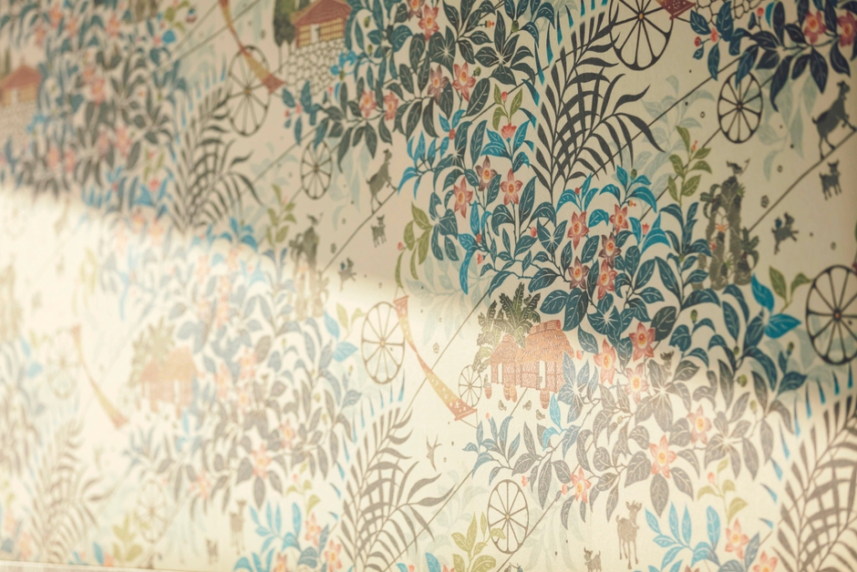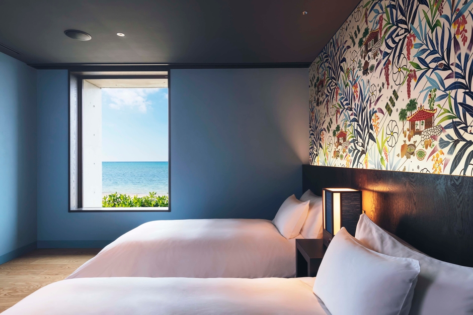 ベッドルームの壁紙には、琉球紅型(びんがた)が描かれています。山羊や月桃といった沖縄で馴染みのある動植物をモチーフに、読谷村に伝わる伝説や昔ながらの風習をストーリーとして加えたオリジナルのデザインです。おやすみ前に、沖縄で過ごした一日を振り返って楽しく話をしてもらえたら、という職人の思いが込められています。客室タイプにより、異なるデザインの紅型を楽しめます。壁紙の他にも、客室には読谷村で古くから受け継がれている織物「読谷山花織」を使ったコースターや、「やちむん(やきもの)」など、さまざまな工芸品を取り入れました。実際に手に取って使うことで、その美しさを体感できます。