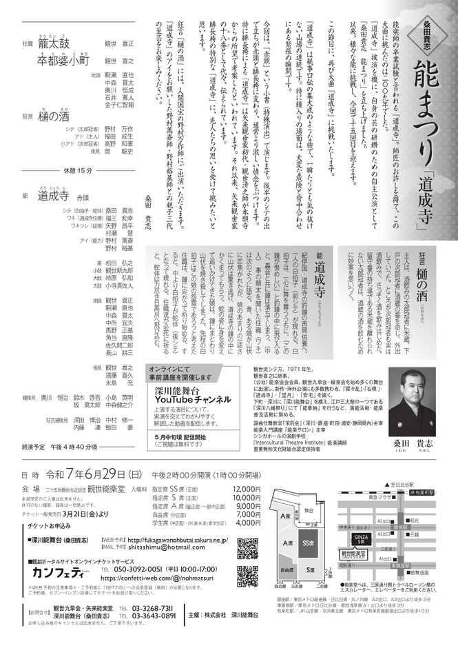 株式会社深川能舞台主催、桑田貴志 能まつり「道成寺」が2025年6月29日 (日)に二十五世観世左近記念観世能楽堂(東京都中央区銀座6-10-1)にて上演されます。