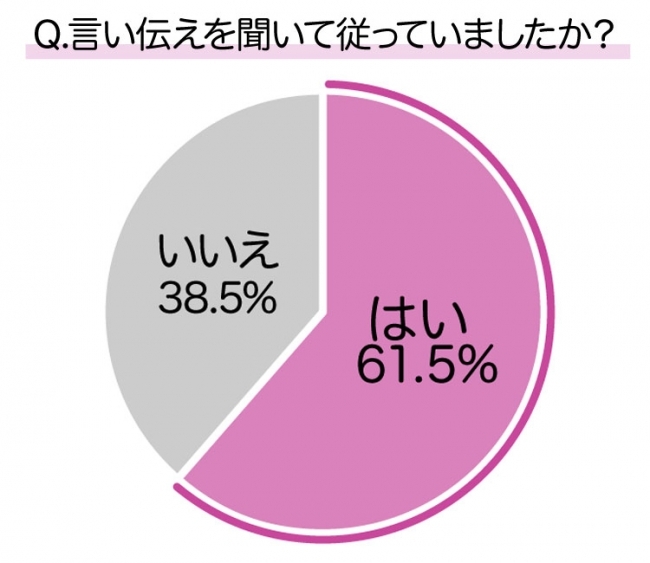 その結果、「それを聞いて従っていた」人は約61%。つまり半数以上の女性が言い伝えに従っていたということです。愛娘の将来を案ずる親ならば、つい口うるさく言い伝えを守らせた方も多かったでしょう。