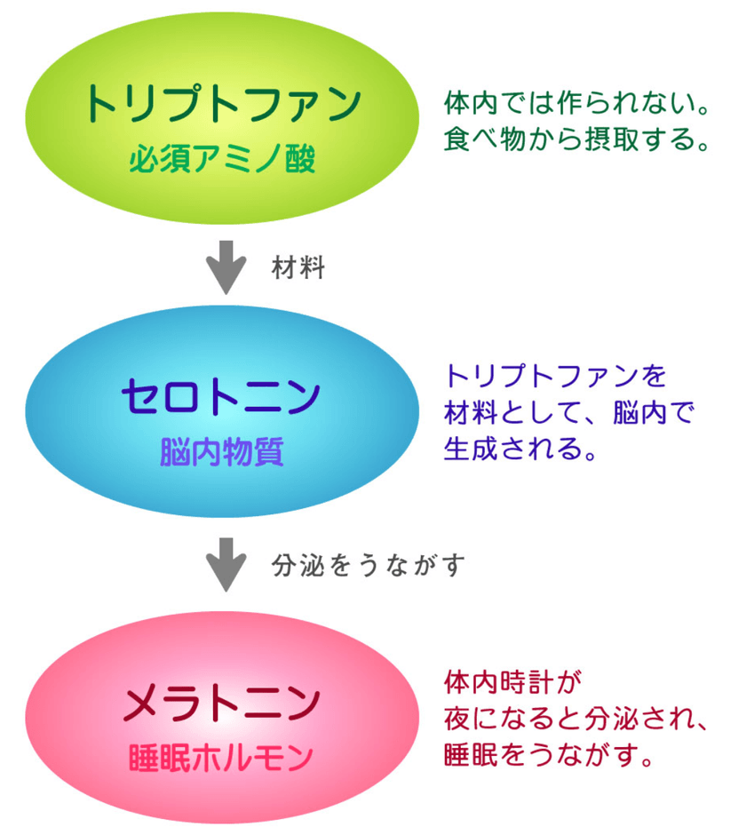 そして、メラトニンがしっかりと分泌されるためには、メラトニンの原料となるセロトニンが、日中にしっかりと分泌されている必要があります。