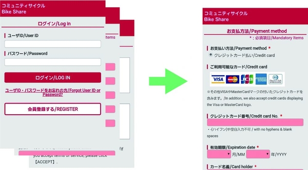 ①WEBページで利用する駐輪場を選択し、使用する自転車の番号を選択し、予約申し込みをしてください。