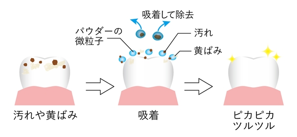 パウダーの微粒子が歯を削ることなく黄ばみ汚れを吸着して除去。