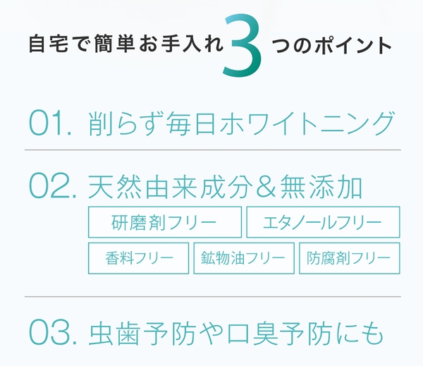 歯と同成分、ヒドロキシアパタイト(清掃剤)を独自処方でパウダーに高配合。細かい粒子が歯の隅々まで入り込み歯垢を除去。気になる口臭予防にも。