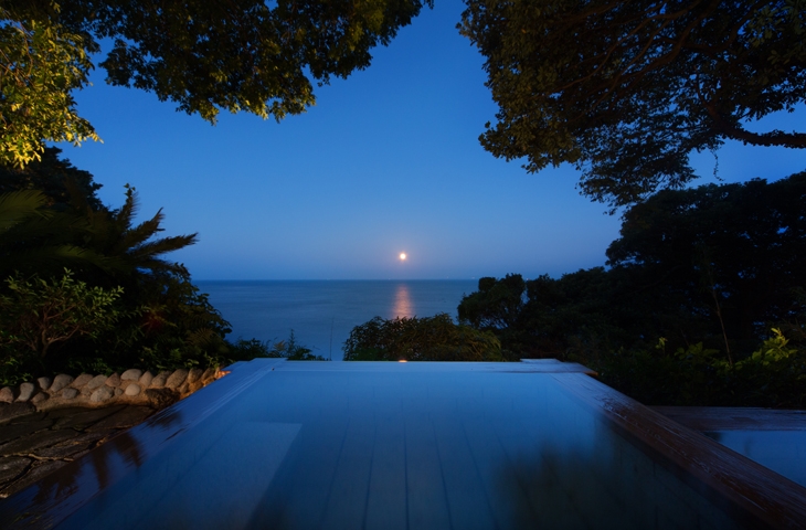 静かな海沿いの北川温泉(ほっかわおんせん)に佇む、全室オーシャンビューの隠れ家リゾート。客室やレストラン、インフィニティ露天風呂から、空と海が溶けあうような青と青の絶景をご覧いただけます。満月の前後には、北川温泉のパワースポットとして人気の「ムーンロード」もお愉しみいただけます。