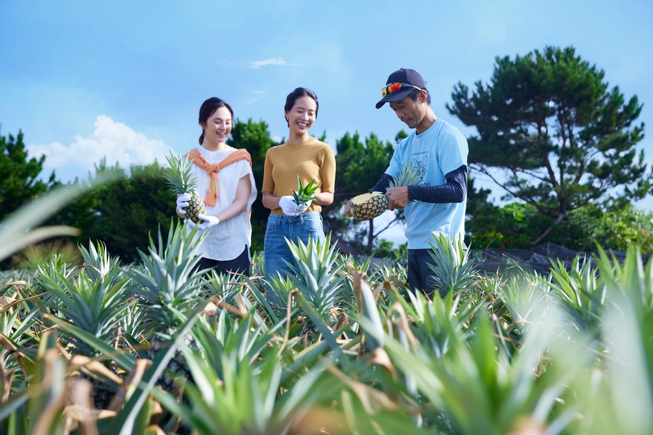ピーチパインは畑でどのように育ち、葉っぱの形がどうなっているのか、収穫するまでにどれくらいの時間がかかるのかなど、農家さんが分かりやすく紹介します。実際に鎌を使ってパインの収穫も行い、大人同士やご家族まで楽しめる体験です。収穫したピーチパインは箱詰めし、ご自宅に送ります。自宅に戻ってからも西表島で収穫したピーチパインを楽しめます。