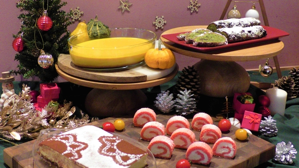 ビュッフェレストラン「SHAKI SHAKI」のディナーでは、野菜を使用したクリスマスベジデザートが登場。ほうれん草を使用したシュトーレン、かぼちゃのプリン、トマトのロールケーキ、大豆のティラミスなどを楽しめます。