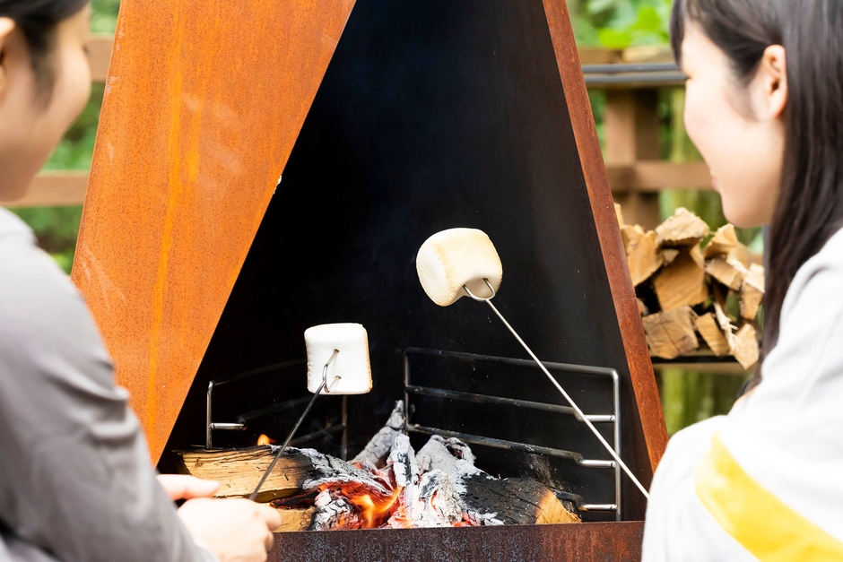 焚き火を使ったスイーツ作りは、星野温泉 トンボの湯からほど近い、川辺のテラス(軽井沢別荘Naviのテラス)で行います。仲間との共同作業で薪割りや火おこしを行い、炙ったマシュマロをクラッカーに挟んで食べる「スモア」や、「焼きリンゴ」を作ります。焚き火を囲みながら仲間同士で語らい、熱々のスイーツを味わう、いつもとは違う非日常のひとときです。