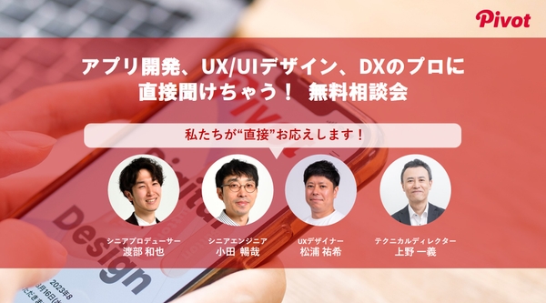 株式会社PIVOT(URL: https://pivot.jp/、所在地:東京都港区、代表取締役社長:宮嵜泰成)は、デジタルプロダクトにおける「ユーザーの最高体験」の実現を目指すプロフェッショナル集団です。現在、アプリ開発、UX/UIデザイン、DX推進の各分野の専門家による無料相談会を2025年5月20日㈫~2025年6月20日㈮までの期間限定で実施しております。これまで数々のデジタル課題に向き合ってきた専門家があなたの「モヤモヤ」をスッキリ解決します。