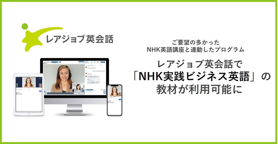 人にまつわるデータを活用し、グローバルに活躍する人々を生み出す株式会社レアジョブ(以下、レアジョブ)は、株式会社NHKエデュケーショナル(以下、NHKエデュケーショナル)の協力のもと、オンライン英会話サービス「レアジョブ英会話」にて、NHK語学番組「NHK実践ビジネス英語」を用いたプログラムを提供開始いたします。