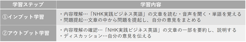 今回、「レアジョブ英会話」を通じて利用できる教材「NHK実践ビジネス英語」では、“インプット学習(読む・聞く)”とレッスンを行う“アウトプット学習(ディスカッション)”の2段階に分けて、学習機会を提供いたします。ビジネスシーンのあらゆるテーマに対して、インプット学習で思考力を鍛え、アウトプット学習で発信力を鍛えることを目指します。
