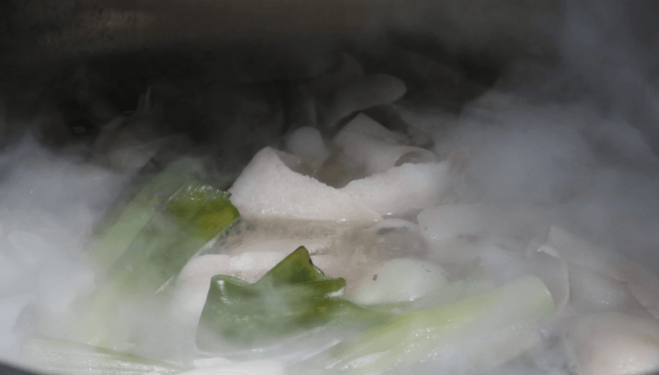 スープはハンマーで砕いたゲンコツを数種類の野菜と一緒に強火で時間をかけて出汁を取っています。チャーシューを一緒に煮込む事でスープのコクと旨みが出て、濃厚な味わいに仕上げております。