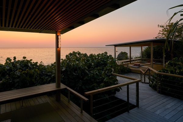 海に臨む西海岸線の高台に立つカフェでは、海に沈む夕日を眺めることができます。通常は日の入と共に営業を終えますが、イベント期間中は夜の営業も行います。カフェエリアにある大屋根デッキは、空の情景と共に夕焼けのオレンジ色から夜空の瑠璃色へ照明が変化し、海辺のテラスには、沖縄の伝統的な織物「読谷山花織(よみたんざんはなおり)」がモチーフのライトが灯ります。