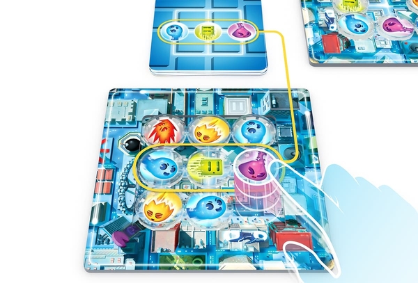 自分のボードの枠内で電子のコマ8個を素早く指でスライドさせ、いち早く場の指示カード通りの色並びの達成を目指すゲーム。1個ずつ空きスペースにスライドさせて組み替えなければならないため、頭と指を猛スピードで動かさなければいけません。