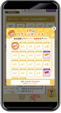 この5daysチャレンジによる健康改善取り組みの継続の支援をより強化し、ユーザーさまにNeoコーチを使う楽しさを感じていただくため、ログインボーナス機能を追加しました。月内の累計ログイン日数に応じ、アプリ内で使用できるプレゼント抽選券や、抽選券に引き換えられるポイントを受け取ることができます。