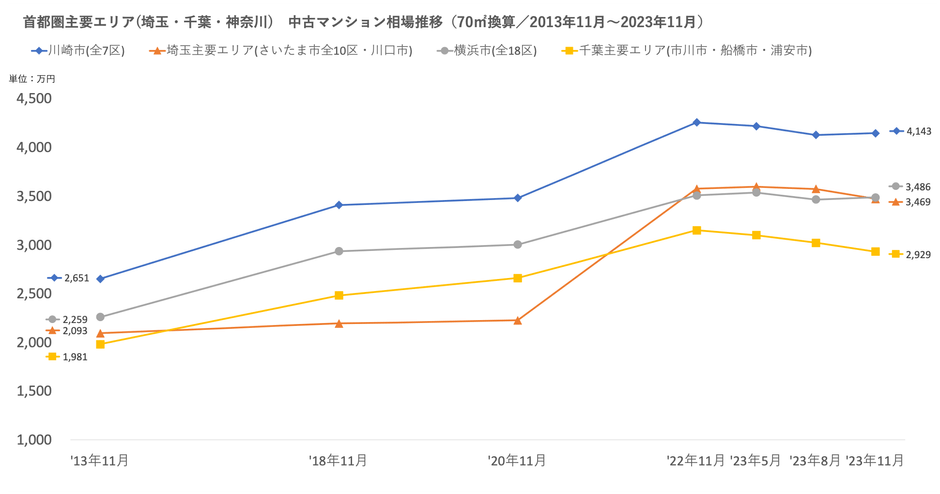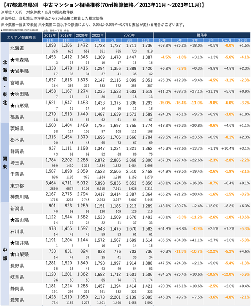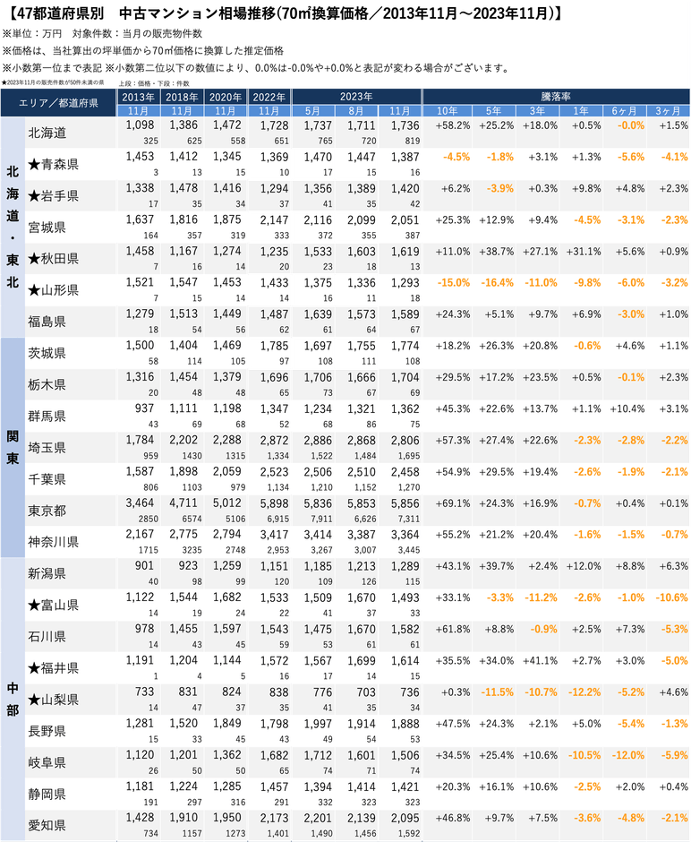 「不動産×WEB×ビッグデータ」の領域で、さまざまな不動産テックサービスを展開する株式会社ワンノブアカインド(本社:東京都港区、代表取締役社長:川島 直也、以下当社)は、当社が運営しているマンション情報サイト「マンションレビュー」の保有データを元に、全国の2023年11月の中古マンション相場を調査。坪単価をベースに70㎡での価格に換算した「中古マンション価格」*1について、10年前・5年前・3年前・前年からの推移を都道府県別・エリアごとにまとめましたので、発表いたします。