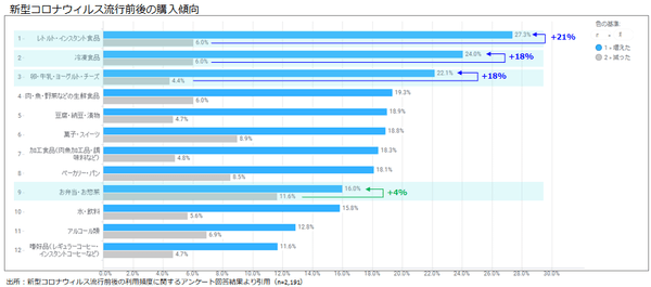 - スーパーでコロナ流行前後に購入が増えた品目、減った品目
