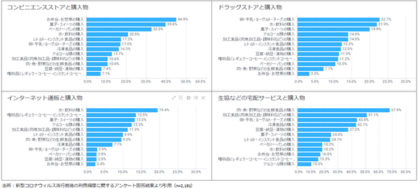 ●コンビニではお弁当や菓子・スイーツ、ドラッグストアでは乳製品、水・飲料、ネット通販では水・飲料、宅配サービスでは生鮮品の購買が伸びている。