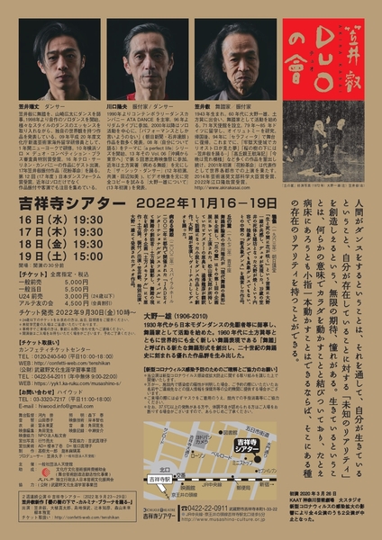 一般社団法人天使館主催、『笠井叡 DUOの會』が2022年11月16日 (水) ~2022年11月19日 (土)に吉祥寺シアター(東京都武蔵野市吉祥寺本町1丁目33番22号)にて上演されます。