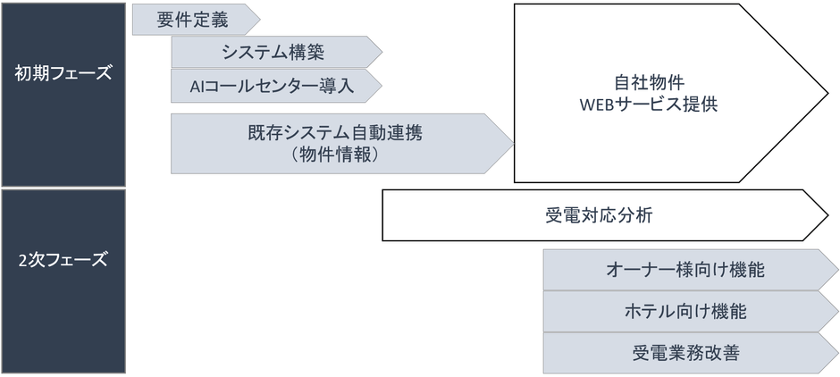 「賃貸不動産DX」システムの導入を礎とし、既存システムとの連携、機能拡充、AIコールセンター導入を予定しており、将来的には、入居者向けアプリ、オーナー様向け機能、ホテル事業向け予約システムの構築も検討しております。
