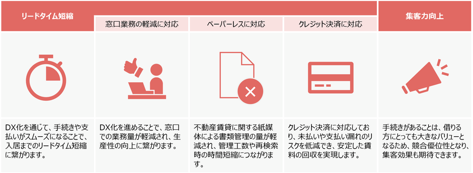 「賃貸不動産DX」システムでは、このような手間を軽減することで、入居までのリードタイムを短縮するとともに、ユーザビリティ向上による、利用者増加(集客力向上)を実現致します。