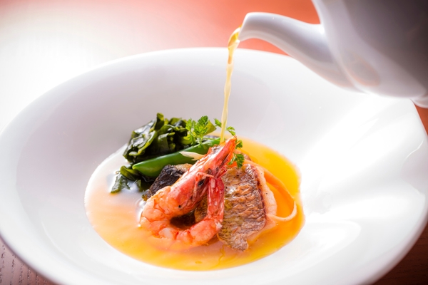 香ばしく焼き上げた鳴門鯛と新鮮な魚介類を香味野菜とじっくり煮込み、季節の野菜を添えて。濃厚なスープに薄く切ったバゲットとルイユをお好みでどうぞ。