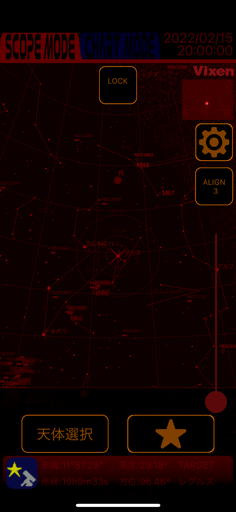 アプリ画面の星図上に表示された目標やキーに、十字カーソルをスライドすることで赤道儀を操作します。画面上の指定の場所を探す必要はありませんので、天体望遠鏡を覗きながらの操作も容易です。