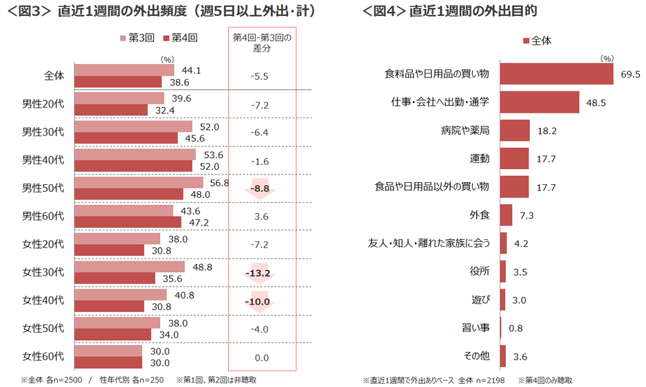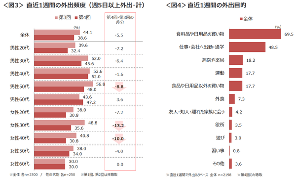 ☑直近1週間で週5日以上の外出割合は全体的に下がっていることが判明。第3回の調査で週5日以上の外出割合が最も高かった男性50代も、今回約9ptマイナスと大きく減少。女性30代・40代も10pt以上減少した。一方、男性40代は前回とあまり変わらず、ほぼ毎日外出が続いている様子。<図3>直近1週間の外出目的と合わせてみると、全体の約半数が仕事や出勤・通学のために外出していることからも、職種や勤務先によってはリモートワークに切り替えるのが難しい実態が浮き彫りとなった。<図4>