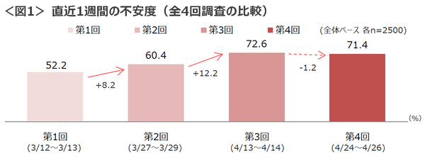 ☑今回、直近1週間で不安を感じた割合は全体で約7割となった。第1回調査から第3回までは回を追うごとに不安度は上昇していたが第4回である今回は前回と同程度の割合となり、不安度の高止まり傾向がみられる。<図1>