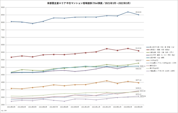 ・首都圏の主要エリアでの2022年3月の70㎡換算推定価格は、「都心5区(千代田・中央・港・新宿・渋谷)」「城南(品川・目黒・大田・世田谷)」「川崎市(全7区)」で前月より下落したが、その他エリアでは上昇。